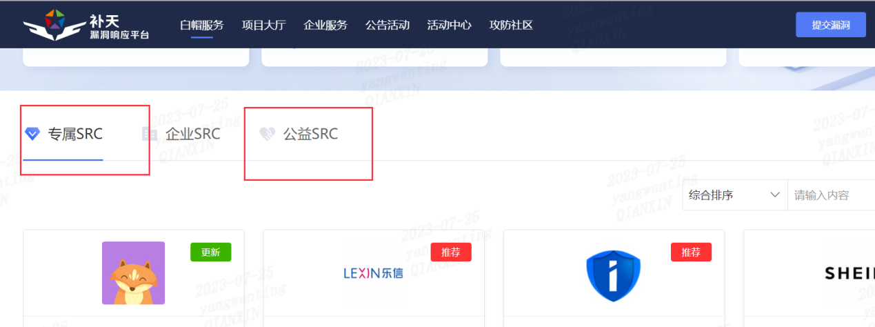 在项目大厅我们可以看到专属SRC、公益SRC还有就是未注册的厂商了。